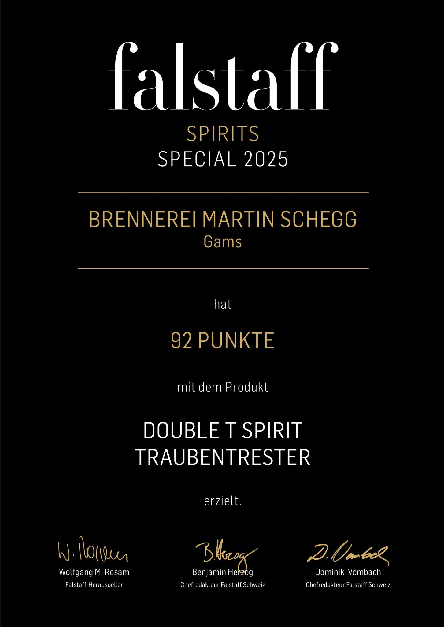 Auszeichnungen: 2025 von Falstaff mit 92 Punkten prämiert, 2023/24 Gold DistiSuisse und 2014 Ostschweizer Edelbrand Prämierung